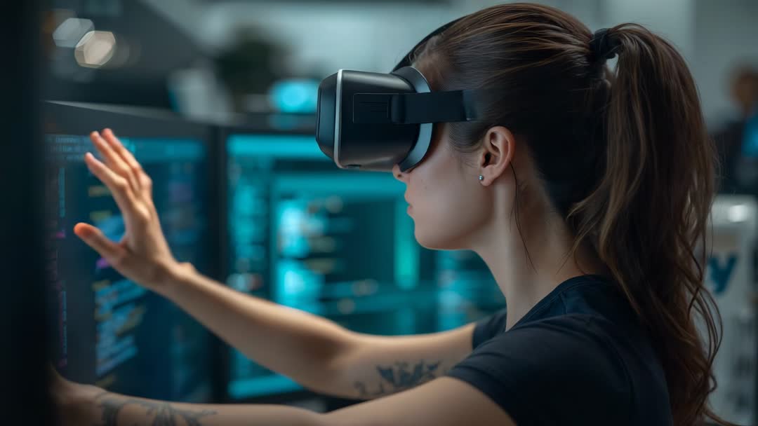 AI Generated Image. Showing woman wearing VR headset and interacting with multi-screen developer interface using gesture control and hand tracking. Bathing lab space in cool blue light with code and UI elements visible on monitors. Demonstrating VR UX testing, immersive software development, UI design review, and hands-on training for AR/VR projects. Fitting use cases: tech startup promos, conference openers, e-learning modules, blog headers, and product demo reels. Recommend slow pan or subtle parallax to emphasize depth, loopable segment for background, and tight crop on hands for tutorial clips.