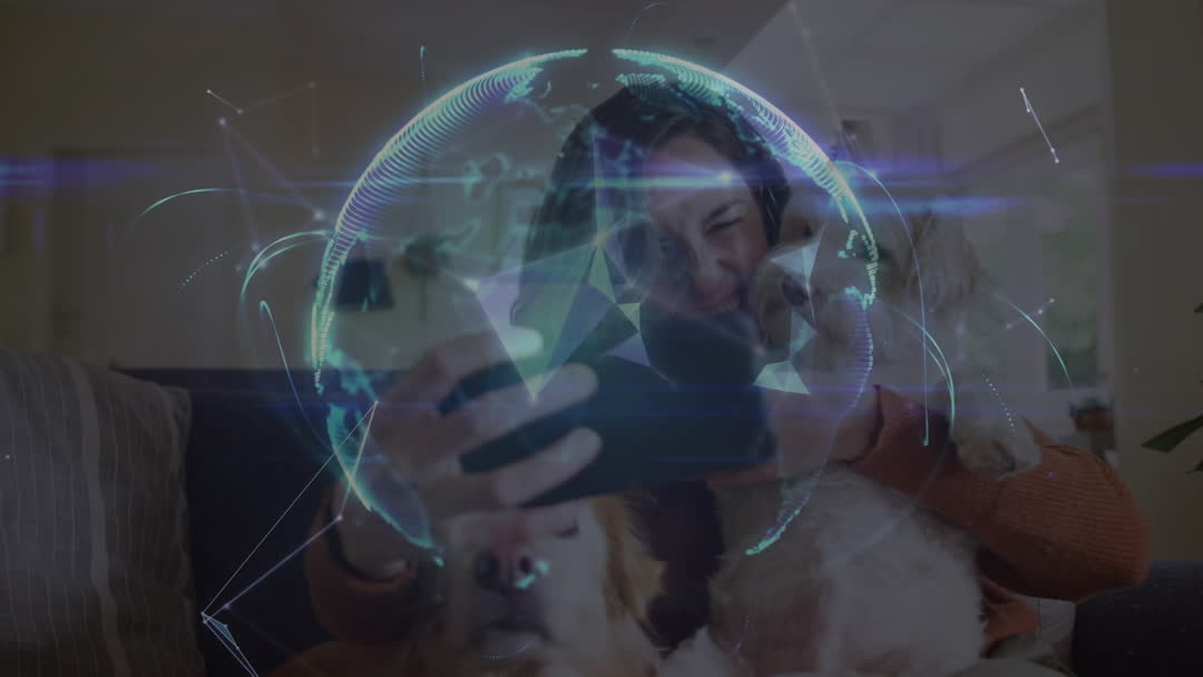 Young woman enjoying time with her dogs while exploring futuristic technology. A digital globe and geometric shapes overlay, emphasizing connection and modern digital lifestyle. Perfect for illustrating concepts of global communication, tech innovation, and joyful moments with pets in a digitally connected world.