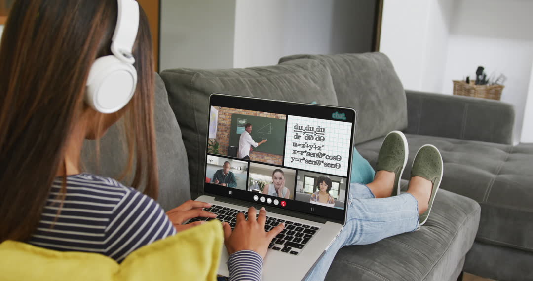 A woman is using headphones and engaging in an online language class via video call while lounging on a couch. This scene highlights the convenience of remote learning with technology like laptops and headphones. It is ideal for illustrating online education, virtual language lessons, digital learning tools, and concepts related to telecommuting and staying connected in a modern home environment.