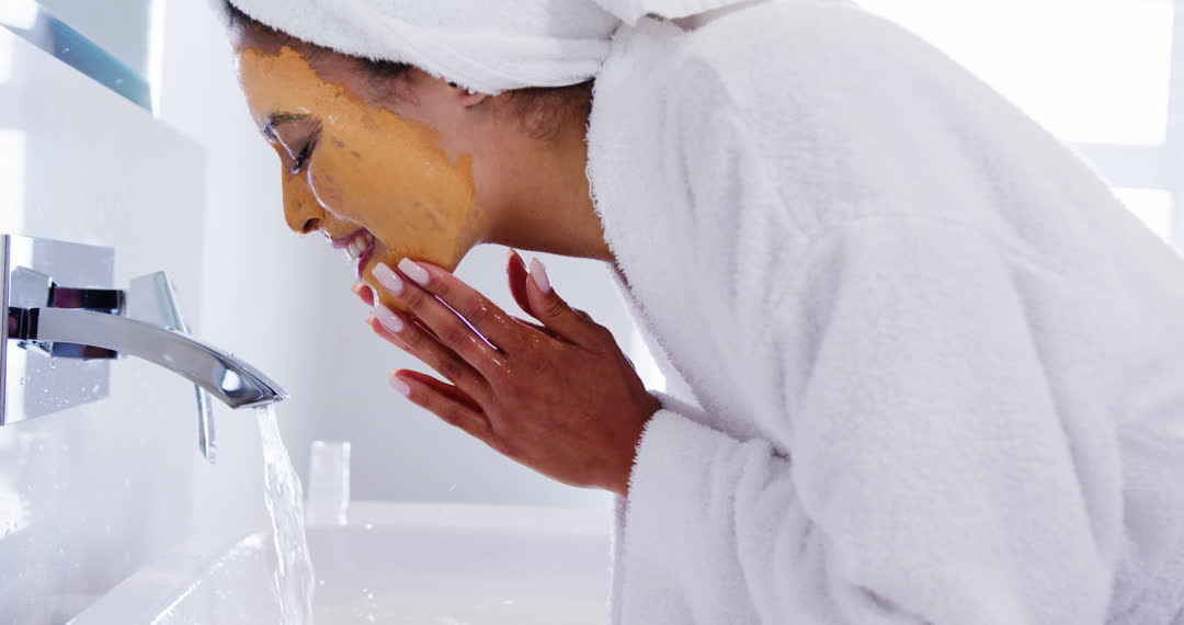 - Woman With Skincare Mask Washing Face in Morning Routine