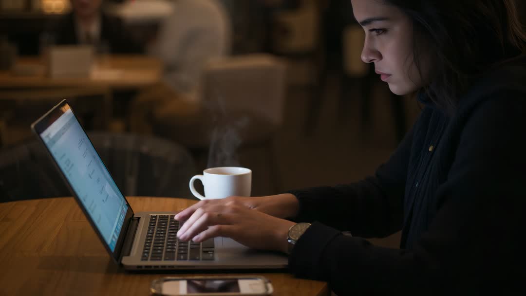 - Woman Working Late on Laptop in Cozy Cafe with Steaming Mug and Smartphone