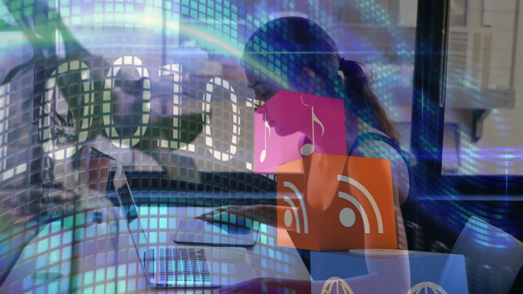A businesswoman working on her laptop surrounded by digital data and multimedia icons, representing modern technology integration in professional settings. Useful for depicting concepts of connectivity, online business solutions, technological advancement, or workplace innovation.