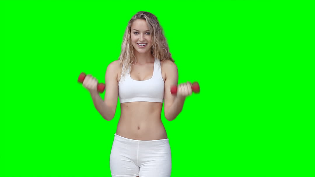 Woman engaged in a workout holding red dumbbells, wearing fitness attire. Appears against a green screen, suggesting an adaptable visual for health and fitness promotions, personal training advertisements, or website graphics. Ideal for concepts related to exercise guides, gym appeals, and active lifestyle editorial.