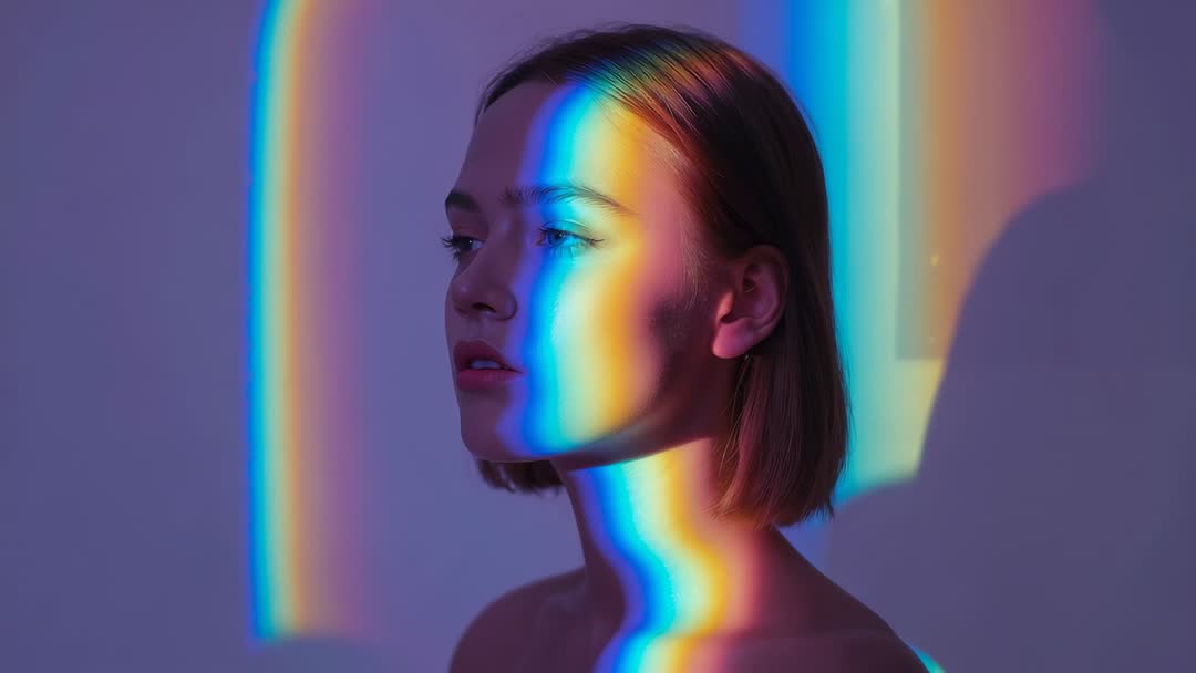 - Woman's Face Illuminated by Shifting Prism Light, Tranquil Backdrop Reveal Sensation
