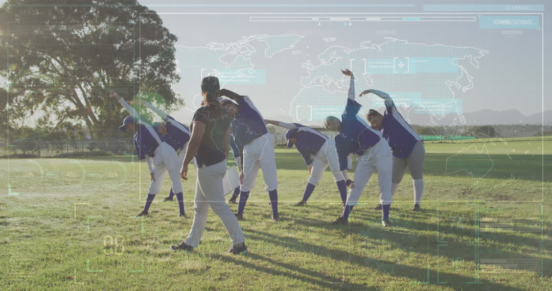 - Women Baseball Team Warming Up with Digital Interface Overlay