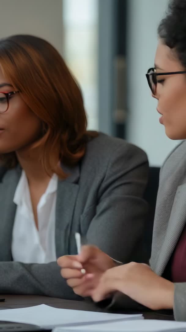 - Women collaborating in boardroom taking notes and reviewing documents vertical video