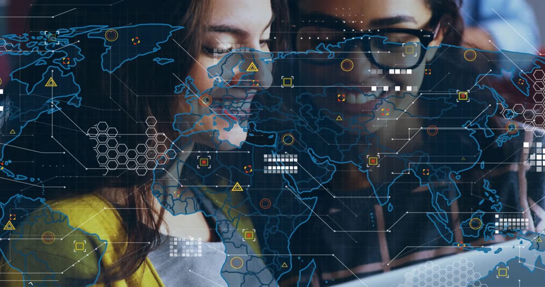 Scene shows two women collaborating over a laptop with a digital network map overlay, highlighting connectivity and data analysis themes. Suitable for illustrating themes of global technology integration, digital collaboration, modern innovation, and professional teamwork.