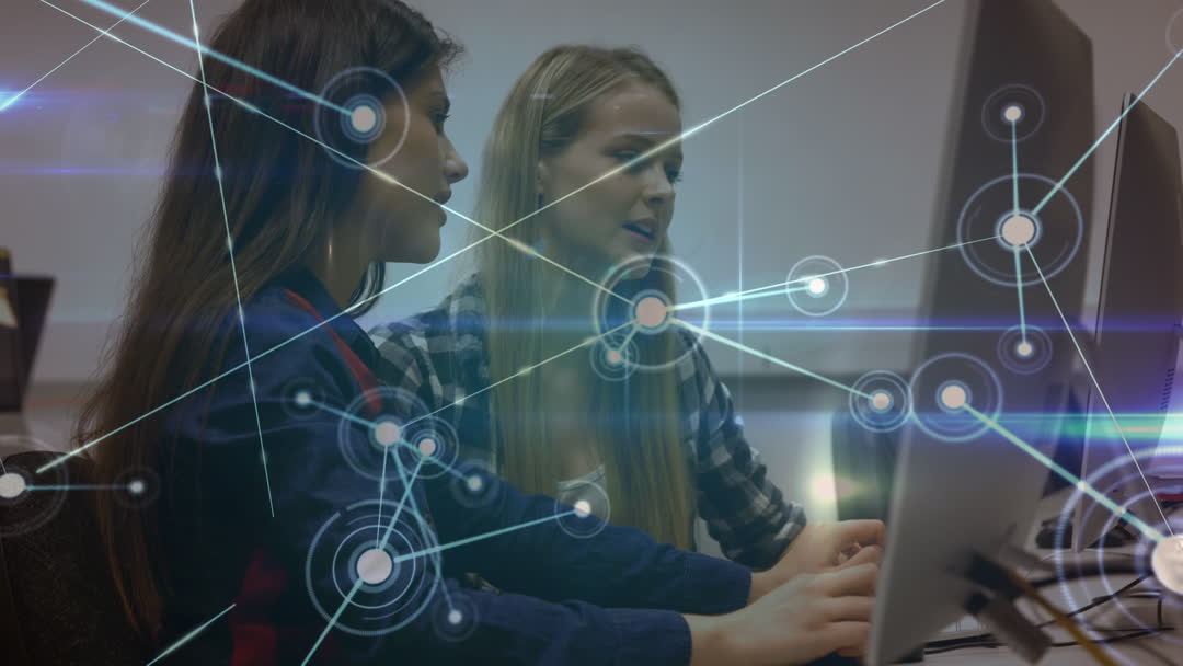 Two women working intently at a computer with digital connections and network lines superimposed suggest collaboration and technological innovation. Ideal for educational and business contexts focusing on teamwork, digital transformation, and technological advancements. Useful for articles or presentations on modern education, digital networking, or futuristic work environments.
