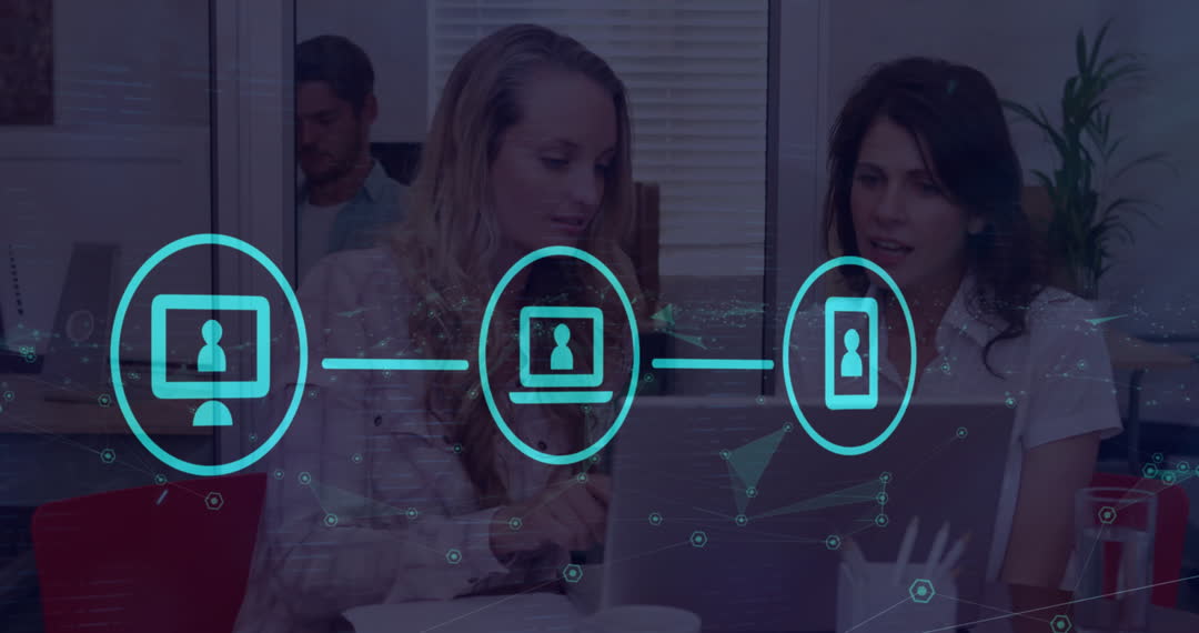 - Women Collaborating with Futuristic Digital Network Overlay in Office
