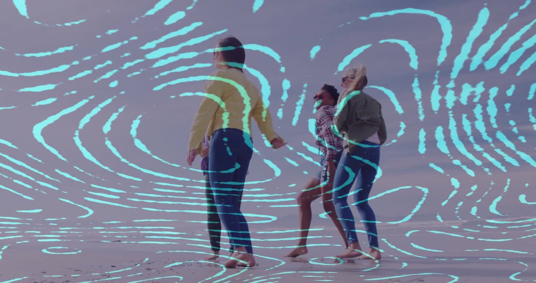 This vibrant scene captures three women dancing energetically on a beach, immersed in angel motions and swirling teal designs. Ideal for vibrant video backdrops or advertisements highlighting friendship, outdoor leisure, or creative energetic expression, this colorful portrayal also serves as inspiration for dance, yoga, and fitness content. Use this visually stimulating scene for campaigns related to lifestyle and entertainment.
