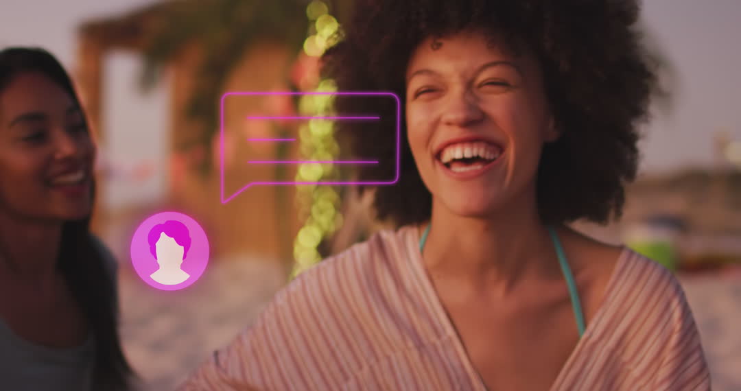 Two women enjoying a lively moment at the beach with social media graphics depicted. Representing friendship and digital communication. Useful for tech, social networking, lifestyle, and summer campaigns.