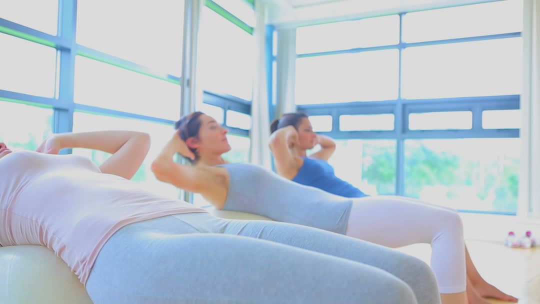Women are engaging in fitness routines using stability balls for sit-ups in a brightly lit gym setting. This promotes physical health and coordination. Ideal for promoting women's fitness classes, gym membership advertisements, and health and wellness campaigns.
