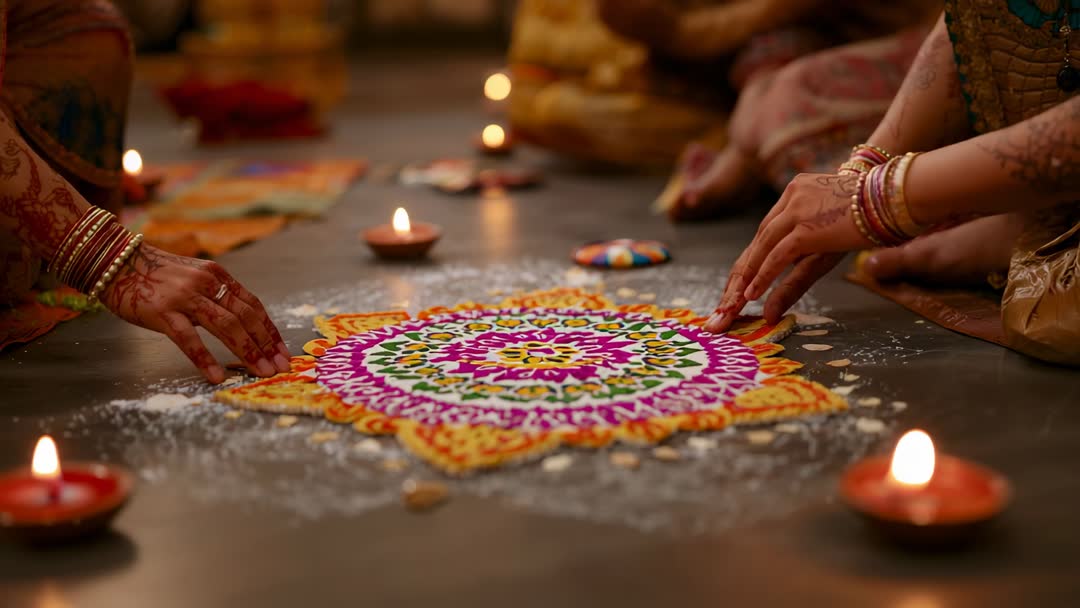 AI Generated Video. Women in traditional sarees decorate beautiful Rangoli using petals and rice, creating an intricate design surrounded by lit diyas. Ideal for conveying themes of cultural heritage, decoration during Indian festivals like Diwali, and customary arts and crafts. Utilizable for content about festive celebrations, traditional Indian art form, or cultural expressions.