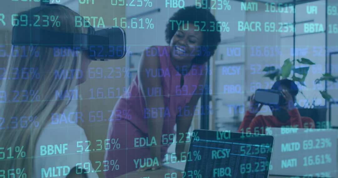 Businesswomen immerse themselves in virtual technology, fostering collaboration and creativity. Double exposure with trading board emphasizes a connection between emerging technologies and financial solutions. Ideal for illustrating themes of fintech innovation, investment growth, and modern teamwork environments.