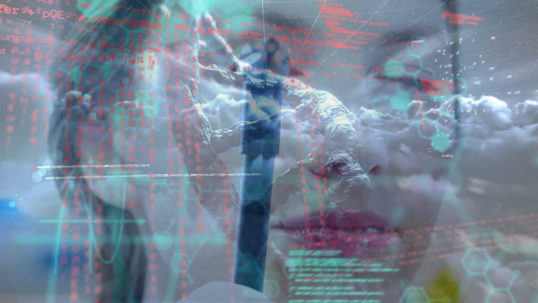 This scene shows digital graphics of data and code layered over a woman's face, merging with cloud videory. It suggests connections between humanity and digital technology, highlighting advancements in science and computer interfaces. Perfect for use in themes around tech innovation, digital transformation, and the intersection of technology and human life.