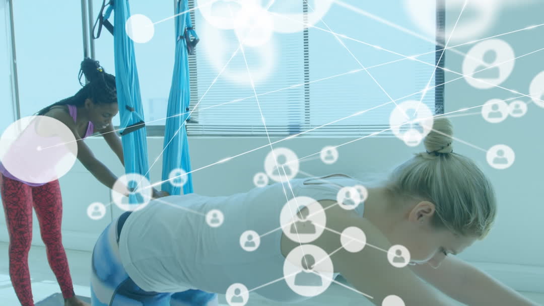 This video depicts two women engaging in a session of aerial yoga, emphasizing both personal wellness and the integration of modern technology with graphical network connections overlay. Ideal for use in marketing fitness technology, online fitness classes, or health social media platforms, as well as illustrating the fusion of digital innovation and healthy lifestyles.