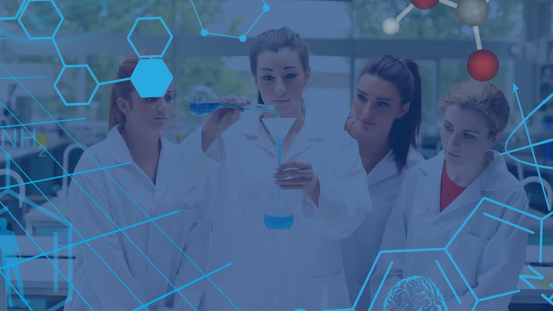 Four women in lab coats engage in a scientific experiment, focusing on a blue liquid in a lab setting, accompanied by virtual data graphics such as molecules and brain illustrations. This video is useful for themes related to women in STEM, technology in scientific research, teamwork in laboratory environments, and educational content about science and technology innovations.
