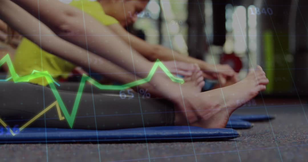 The scene captures three women engaged in forward stretching exercises on blue mats, accompanied by animated graphs representing biometric data and fitness metrics. This blend of physical activity and digital analytics highlights advancements in personalized health tracking and technology integration in fitness. Ideal for content on modern health trends, sports technology innovations, or fitness marketing files emphasizing progress tracking.