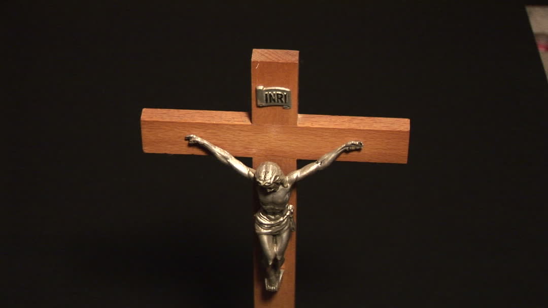 This video features a wooden crucifix with a metal figure of Jesus attached, capturing a prominent Christian symbol of faith and sacrifice. The cross displays the INRI inscription at the top. Suitable for use in religious publications, articles exploring Christian symbols, or materials for church educational programs.