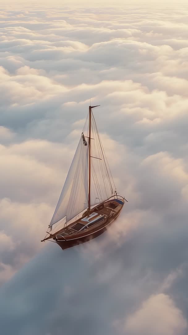 AI Generated Image. Vertical video showing wooden sailboat gliding above sunlit cloudscape at golden hour. Soft warm light bathing translucent sails, gentle breeze filling canvas, hull casting subtle shadow across clouds. Composition emphasizing vertical space and depth, aerial perspective creating sense of elevation, wonder, and quiet motion. Use ideas: promoting travel and adventure brands, inspiring social reels and vertical ads, anchoring meditation and relaxation app backgrounds, building cinematic intros and title sequences, illustrating fantasy or dreamlike editorial spreads, creating striking hero visuals for websites and mobile campaigns, producing looping calming backgrounds for streaming or presentations. Technical notes: vertical 9:16 composition optimized for mobile viewing, gentle color grading and soft vignette enhancing golden hour mood, leave upper third clear for headline text and lower third for logo or caption placement, consider subtle slow zoom or parallax for added depth, seamless looping possible due to smooth continuous motion.