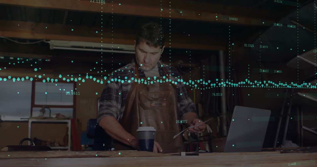 - Woodworker Integrating Technology in Rustic Workshop with Data Visualization