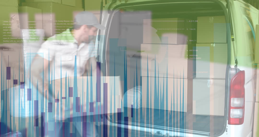 Blurred video of a warehouse worker dressed in casual attire seems loading or unloading packages from a delivery van. Overlayed on the scene, animated financial charts and data suggest a connection between physical operations and digital finance. This might be used in business presentations, online courses on supply chain economics, or marketing campaigns focusing on integrated logistics technologies.