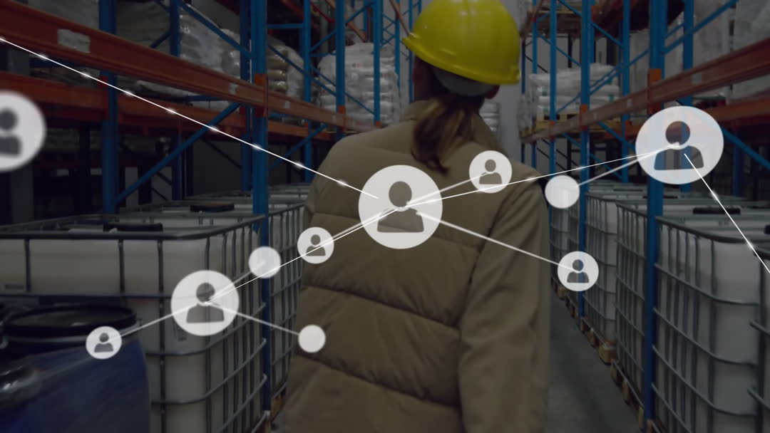 A woman wearing a yellow hard hat navigates a warehouse, emphasizing the interconnectedness of logistics operations through superimposed network icons. Useful for illustrating modern supply chain management, digital integration in industrial settings, and team collaboration.
