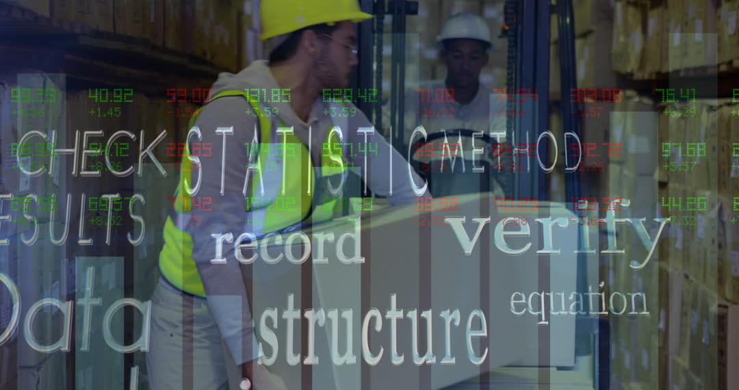 A logistic worker appearing to stack boxes on a forklift overlaid with words like check, verify, method, and structure. This can illustrate the integration of technology in warehouse operations, showing efficiency and analysis in logistics. Useful for subjects involving supply chain management, technological innovations in logistics, and modern warehouse systems.