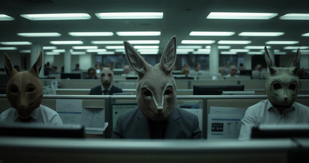 AI Generated Image. The scene features workers seated in a corporate office setting, each donning animal masks like rabbit, fox, and cat for an intriguing twist. The uniform layout, combined with the monochrome tones, evokes strong themes of anonymity and surrealism. AI generation adds a layer of artificiality, making it perfect for editorial use in discussions on modern office culture, art critiques, concepts of identity, or surreal digital artworks.