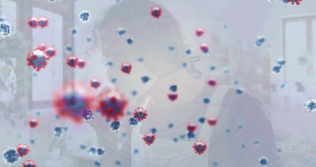 Video frame showing woman working from home with airborne virus particles floating across room and obscuring face. Soft daylight from window creating muted interior tones while red and blue spiky particles layered as digital overlay to visualize viral contamination. Person sitting at desk with plant visible in background, blurred and anonymous, reinforcing concept of invisible health risk in home workspace. Suiting news coverage, public health campaigns, corporate communications on workplace safety, educational explainers about airborne transmission, website banners, blog headers, social media posts, slide decks, healthcare presentations. Suggesting adding text overlay or lower third, animating particle layer for subtle motion, applying slow zoom or parallax for depth, increasing contrast between particles and background, and inserting captions or data graphics for context. Maintaining anonymity of subject recommended for editorial use.
