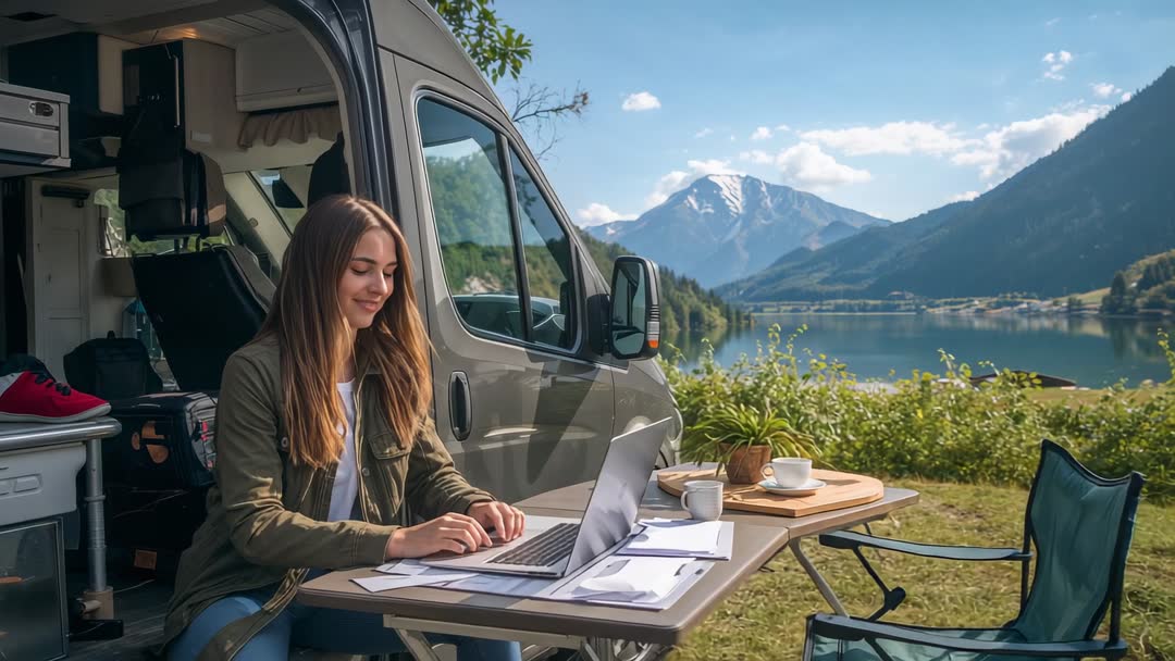 - Working remotely from camper van beside mountain lake, woman typing on laptop outdoors