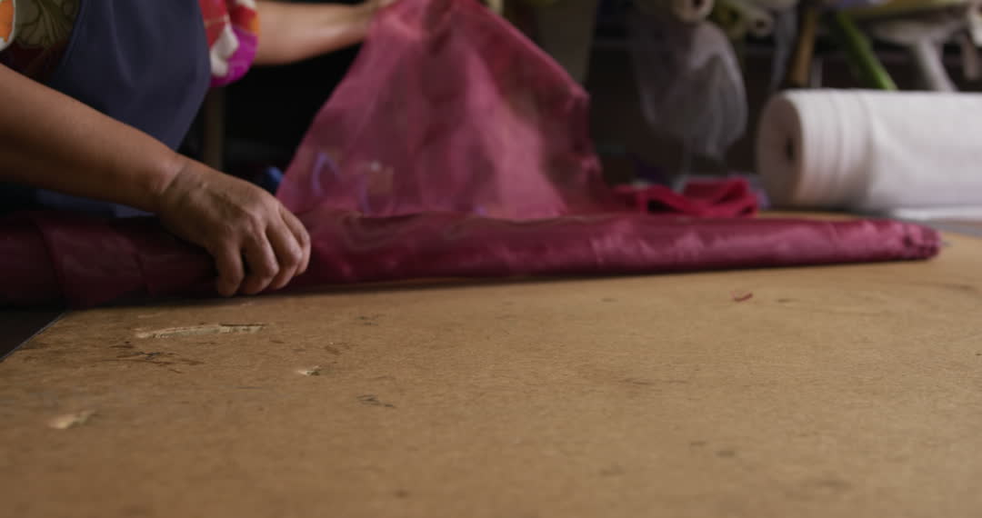 This video showcases a woman rolling pink fabric in a hat factory workshop, ideal for depicting artisanal labor, manufacturing, or textile production. Useful for content related to fashion industry, workshops, or crafting tutorials.