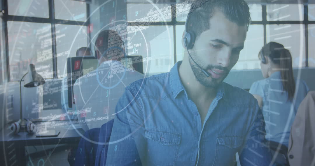 Man wearing headset suggests customer support or team meeting in modern tech office. Overlay of data processing signifies technology and analytics focus. Useful for illustrating teamwork in digital transformation contexts or support services.