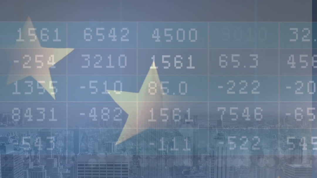 This visual portrays the concept of global economic interconnections and data processing with EU elements overlaid with a cityscape. Useful for illustrating themes of international trade, financial market dynamics, economic policies, and futuristic business contexts. Suitable for presentations, reports, or educational material focusing on global economics and technology.
