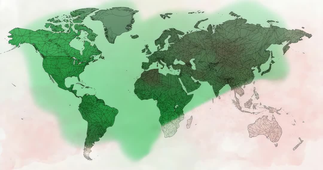 AI Generated Image. This dynamic animation features a wireframe world map gradually overlaid with a green tint expanding across continents. Accompanied by a red haze effect on a textured parchment background, the video powerfully conveys themes of globalization, world networking, and digital connectivity. Ideal for presentations on international relations, educational geography content, and digital strategy visualizations.