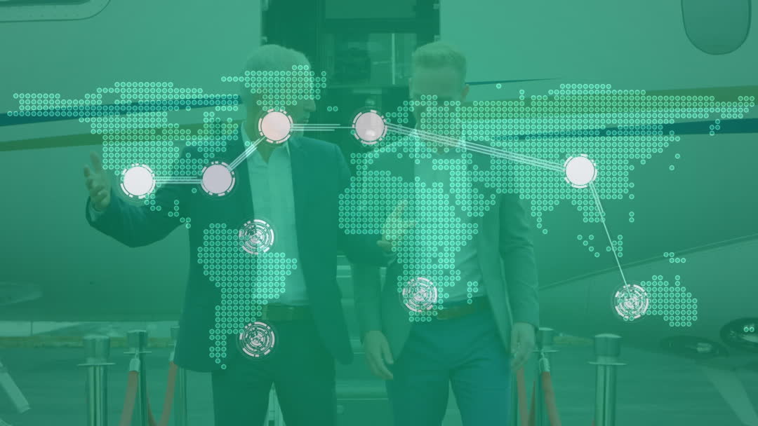Image depicts businessmen with digital world map overlays and network connections, symbolizing global communication and technological connectivity. Ideal for articles or ads about business travel, transportation networks, global business trips, digital transformation, or corporate communications.