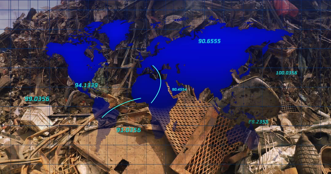 Graphic combines a world map overlay with numeric coordinates placed over pile of scrap, suggesting global reach and environmental concerns. Visualization aligns with themes such as global data analysis, international trade, or impact of recycling industry. Ideal for use in presentations on geopolitics, international commerce or environmental discourse highlighting importance of resource management and global interconnectedness.