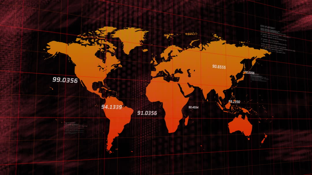 Dynamic digital animation of a world map with grid network and data processing graphics shows various coordinates. Ideal for illustrating themes of technology, cyber security, or global business connections. Suitable for use in presentations about data analytics or as a visual element in tech industry blogs.