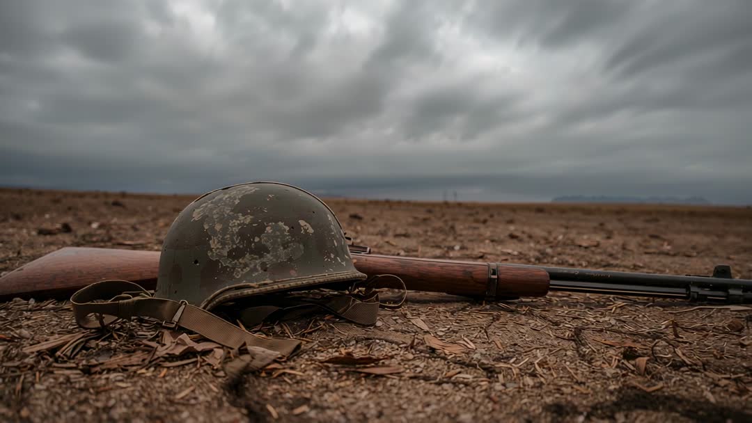 AI Generated Video. Dramatic scene showing a worn military helmet and rifle resting on cracked ground. Overcast skies create a somber atmosphere, emphasizing themes of warfare, survival, and the harsh realities of battle. Ideal for use in discussions of military history, anti-war messaging, or as a visual metaphor for sacrifice and resilience.