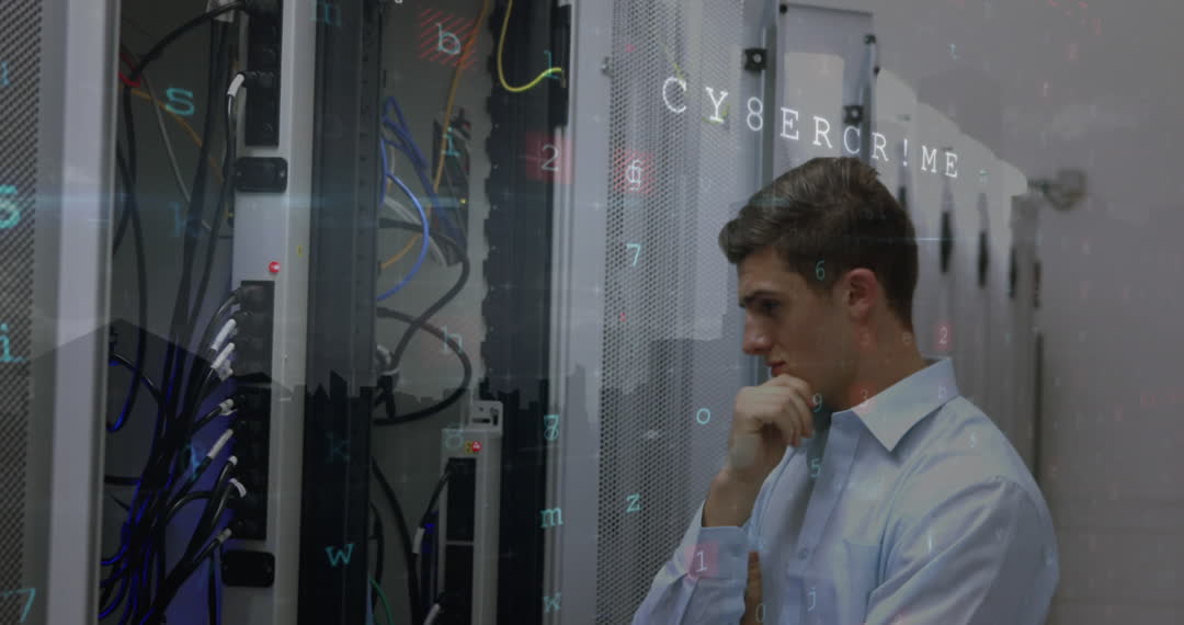 Visual symbolizes concerns about cybersecurity threats with a professional in an IT environment, highlighting the pressing issue of cybercrime. The presence of data graphics emphasizes importance of safeguarding information. Useful for articles and presentations on IT security, cyber awareness sessions, and training materials for data breach prevention.