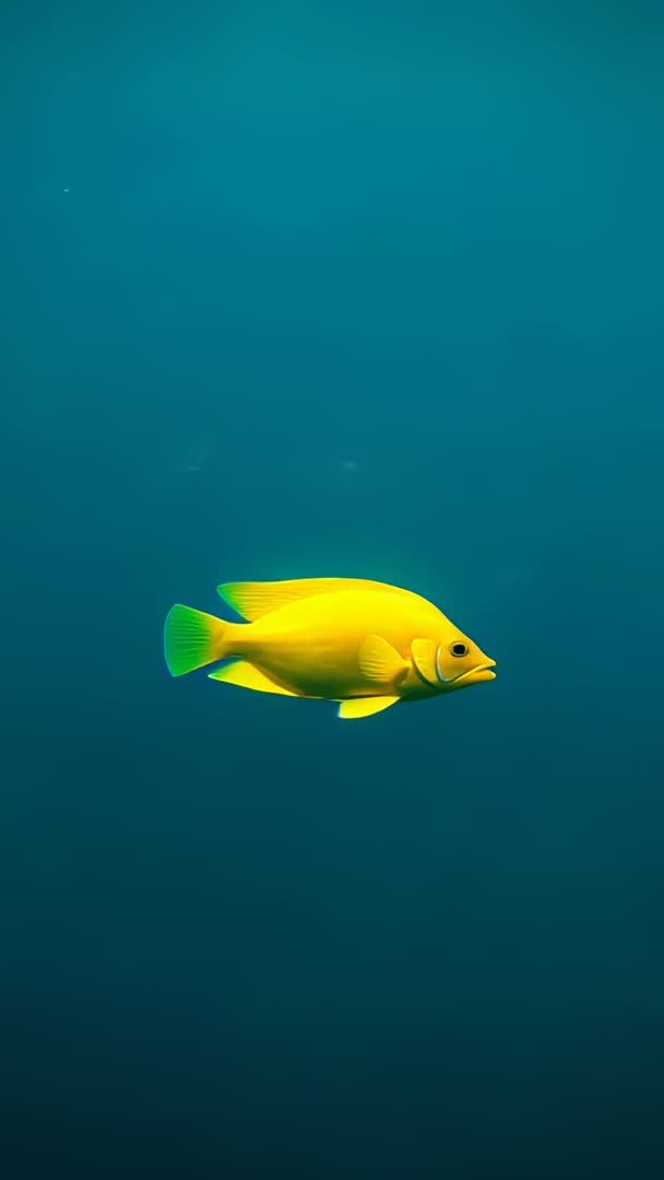 AI Generated Video. Vertical clip featuring single bright yellow fish swimming toward camera through deep teal water. Composition placing fish in lower third with ample negative space above, creating sense of openness and forward motion. Subtle particles and tiny bubbles highlighting depth and scale. Strong color contrast between vivid yellow body and cool teal background enhancing visual focus. Ideal for underwater documentaries, marine conservation campaigns, social media vertical ads, smartphone wallpapers, nature channel openers, aquarium promotions. Clip working well as hero shot for branding, background for text overlays, transitional cut in video montages, or looping clip for digital signage. Suggested uses: short ad spot, environmental PSA, educational reef content, mobile wallpaper, creative art project. Postproduction tips: applying color grade for cinematic mood, slowing clip for dramatic closeup, creating seamless loop for display.