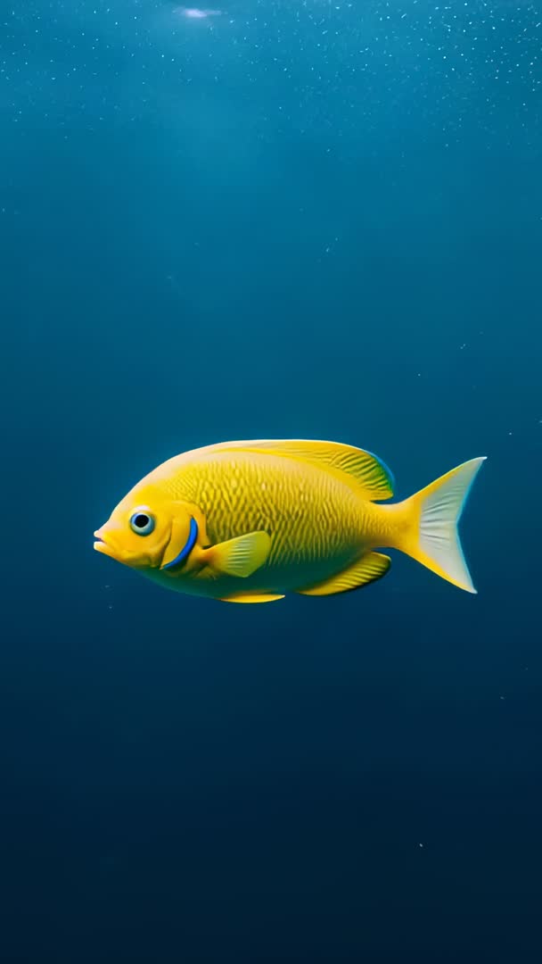 AI Generated Image. Video showing yellow reef fish swimming toward camera across deep blue gradient, sunlit particles drifting upward. Closeup framing highlighting textured scales, vivid yellow coloration, expressive eye, gentle fin motion. Vertical orientation making clip ideal for mobile platforms, social reels, stories, vertical ads. Footage suiting nature documentaries, aquarium promotions, environmental campaigns, educational shorts about marine biodiversity, meditation or relaxation backgrounds, app wallpapers. Simple composition allowing text overlay, logo placement, slow-motion editing, or loopable background use. Color palette offering strong contrast for headline text.