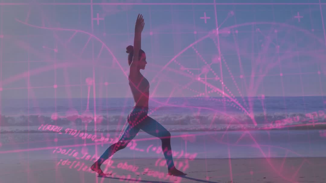 - Yoga at Sunrise on Beach with Digital Health Analytics Overlay