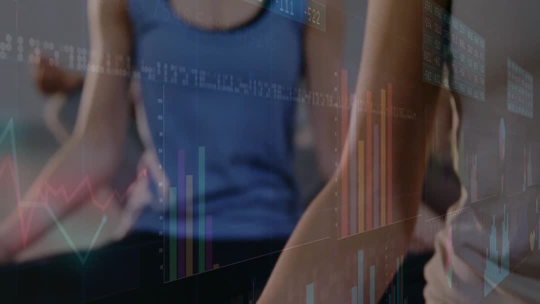 Overlay of meditation class with data charts symbolizes the intersection of mind and data. Perfect for content on personal wellness, data-driven lifestyle choices, or corporate wellness programs integrating physical and mental fitness with analytical insights.
