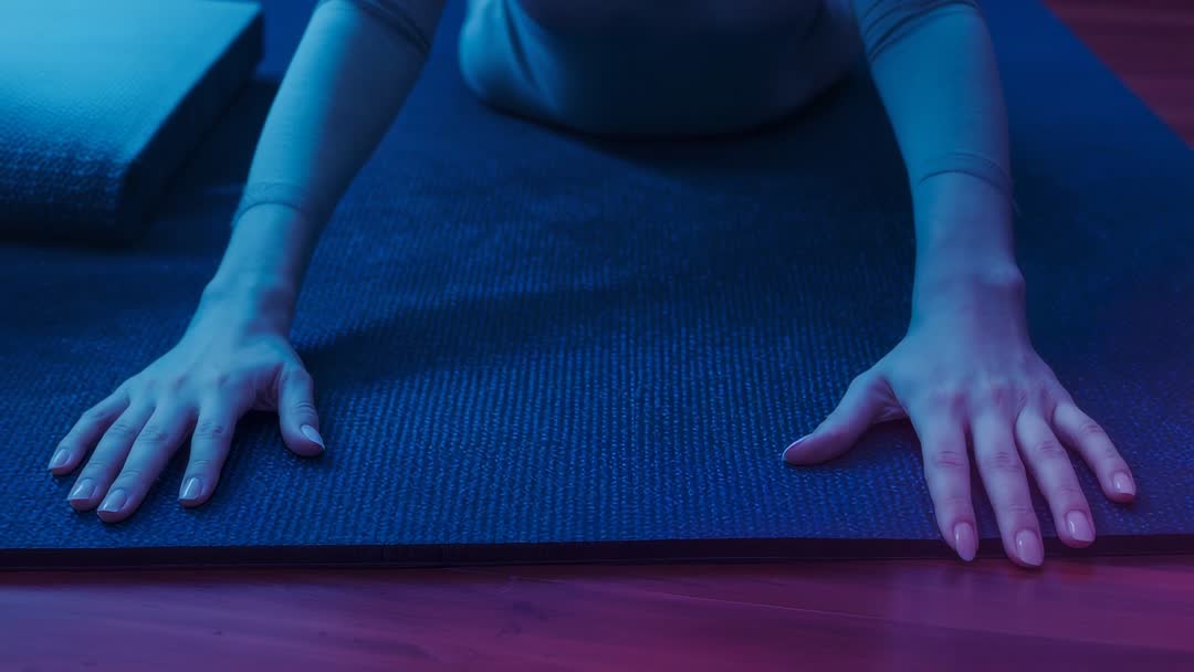 AI Generated Image. This video snapshot depicts a woman engaging in a yoga session, preparing for a backbend progression. Her hands are placed firmly on the yoga mat as she follows through the motions of a stretching session in fitness attire. Adjacent, a cushion suggests impending exercises of various difficulty levels. The calming blue hue creates a tranquil environment ideal for focus and breathwork. This content can be used in articles, advertisements or blogs centered around health, mind-body practices, home workouts, meditation spaces, or guidance for beginners in wellness routines.