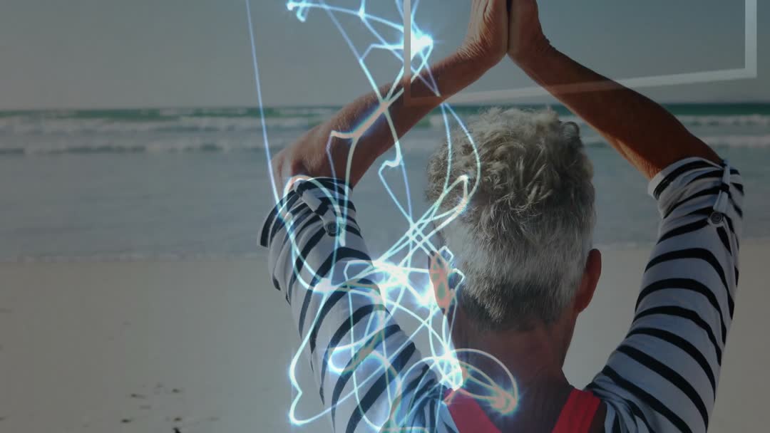 A person practicing yoga on a beach with a dynamic glowing animation overlaying the scene, suggesting a fusion of serenity and technology. Ideal for use in wellness workshops, digital detox projects, or promoting harmony with technology in natural settings. Great for graphics focused on mindfulness and holistic living.