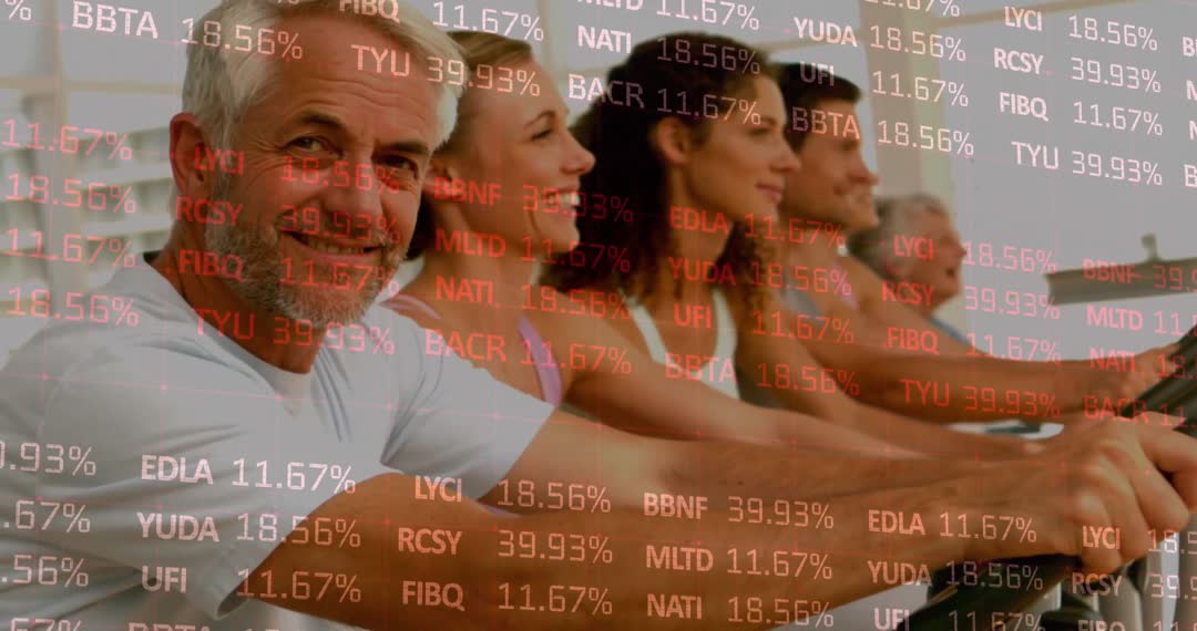 People rowing indoor in a gym contrasts with a stock market ticker overlay, offering a dynamic mix of fitness and finance themes. Useful for illustrating combined themes like exercising while tracking market trends, making financial health a priority, or discussing the energetic crossover between physical activity and financial acuity. Great for use in presentations or articles focusing on maintaining a balance between physical wellbeing and financial monitoring.