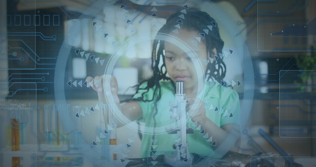 A young African American girl explores scientific experiments using a microscope, captured through a digital interface with a holographic scanning effect. This visual is ideal for educational content, science promotions, or futuristic technology presentations aimed at inspiring young learners.