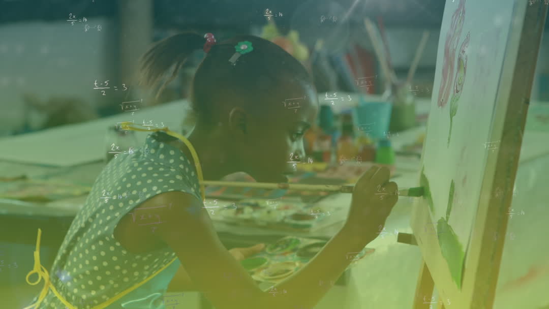 A young girl deeply engaged in painting on a canvas, showcasing concentration and creativity through art. She wears a polka-dot dress and numberless equations slightly overlapping, suggesting a blend of art and technology or learning. Ideal for use in educational materials, advertisements related to art classes or workshops, and any content stressing the importance of art in developing focus and cognitive skills in children.