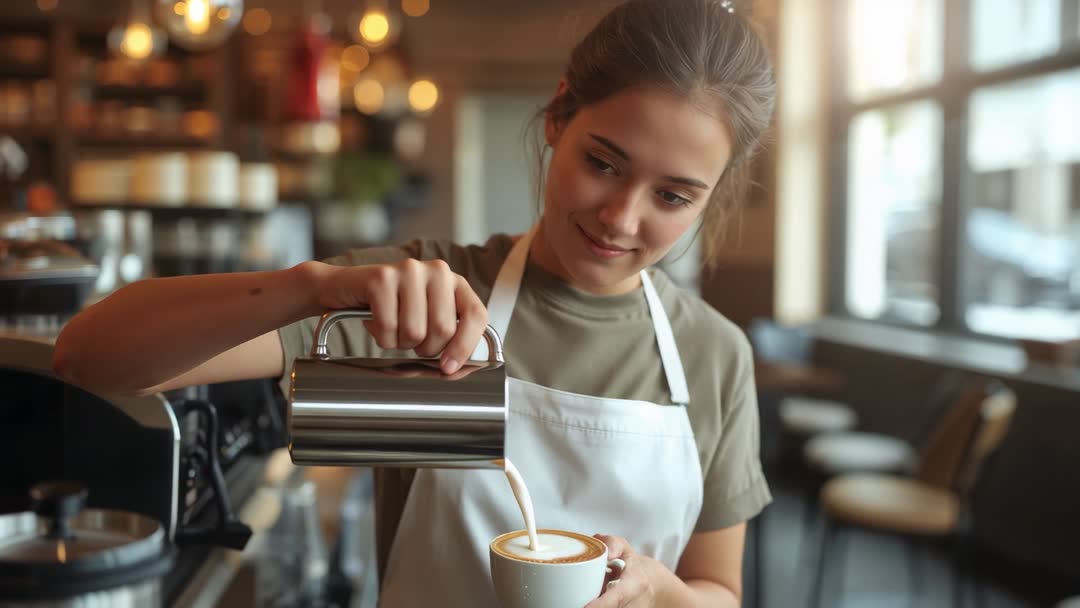 AI Generated Video. Young barista pouring steamed milk from stainless steel pitcher into cup, creating latte art while smiling. Close-up medium shot featuring shallow depth of field, warm bokeh from hanging lights and window daylight illuminating face. Motion suggesting gentle pour and swirling foam, suitable for slow motion or looped video clips. Use for coffee shop marketing, barista training videos, social media reels, website hero banners, blog posts about coffee culture, menu visuals, hospitality and small business advertising, or promotional material for coffee equipment. Mood conveying friendly service, craftsmanship, artisanal beverage preparation and cozy morning atmosphere.